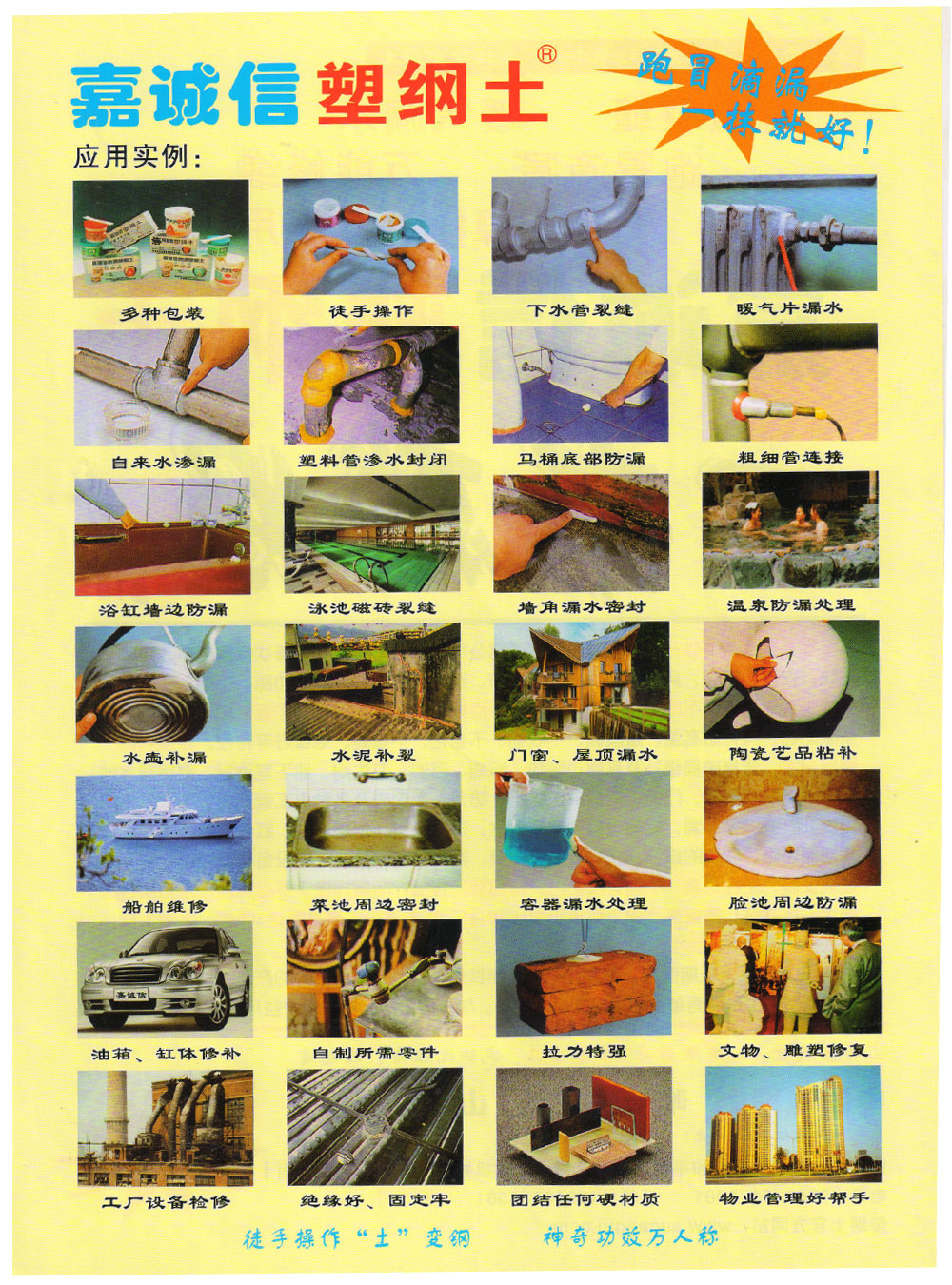 山西嘉誠(chéng)信實(shí)業(yè)有限公司多年來(lái)一直致力于塑鋼土的研究、開(kāi)發(fā),為塑鋼土在我國(guó)的推廣、應(yīng)用與普及立下了汗馬功勞!嘉誠(chéng)信早已成了塑鋼土的代名詞,嘉誠(chéng)信就是塑鋼土,塑鋼土就是嘉誠(chéng)信。跑冒滴漏滲就找嘉誠(chéng)信,要買塑鋼土還找嘉誠(chéng)信,已成為廣大用戶的共識(shí)!